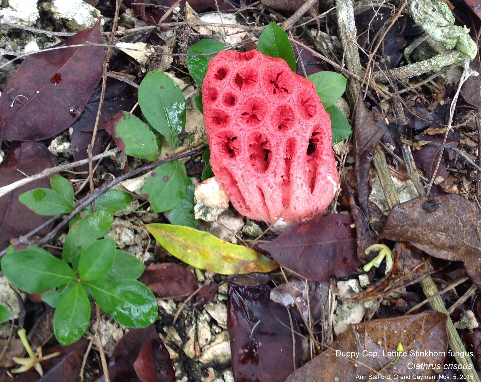 Duppy Cap, Lattice Stinkhorn fungus - Clathrus crispus, Family: CLATHRACEAEThe fruiting bodies pop up in lawns and other areas, often by former tree stumps. They smell foul and attract flies.